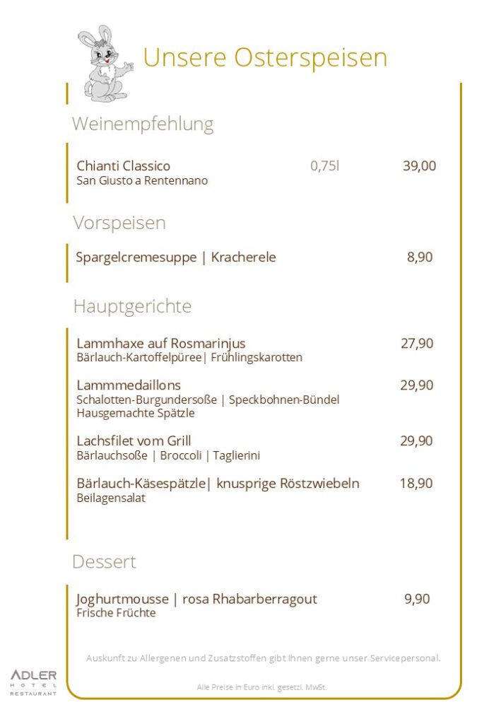 Zusätzlich zu unserer Standardkarte bieten wir Ihnen typische Ostergerichte an.